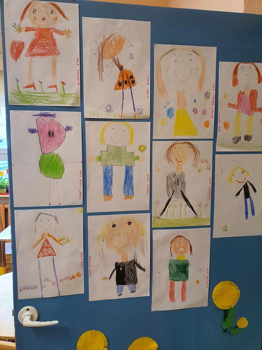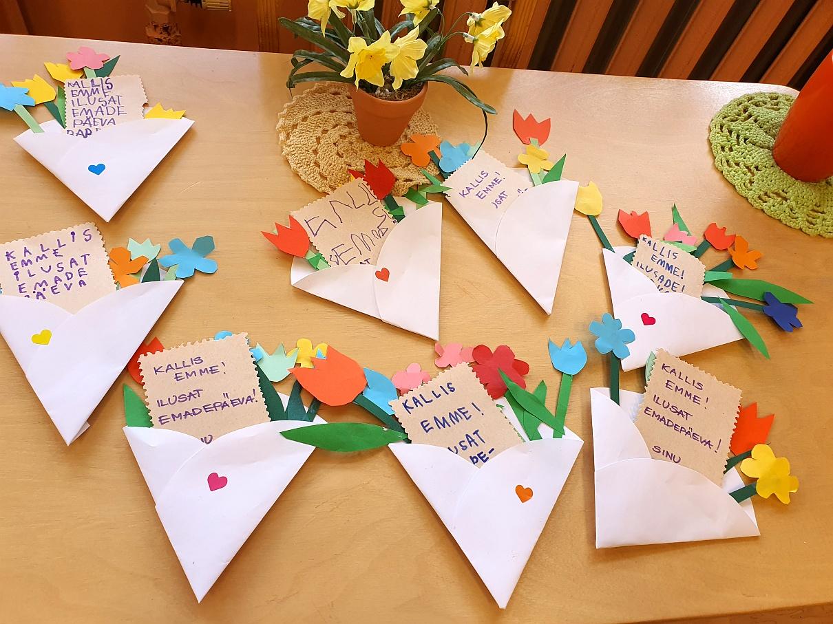 Joonistasime ema portree. Kleepisime kaardikesse lilled ja lisasime head soovid.