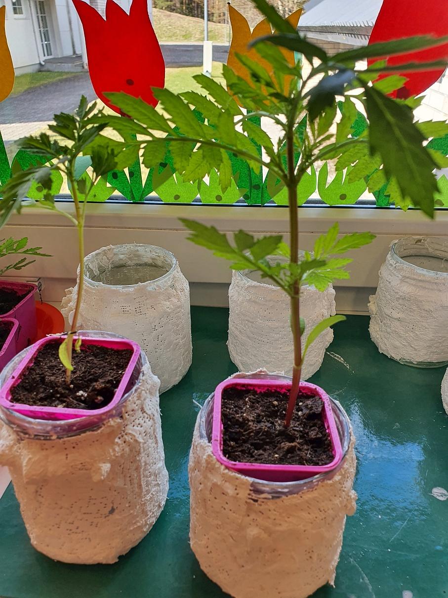 Alustasime emadele kingituste valmistamist ja luuletuse õppimist. Olime varakult külvanud lilleseemned, mida usinalt hooldades saimegi korralikud taimed õienupukestega, mida emadele kinkida. Need tuli nüüd õigetessse pottidesse istutada.