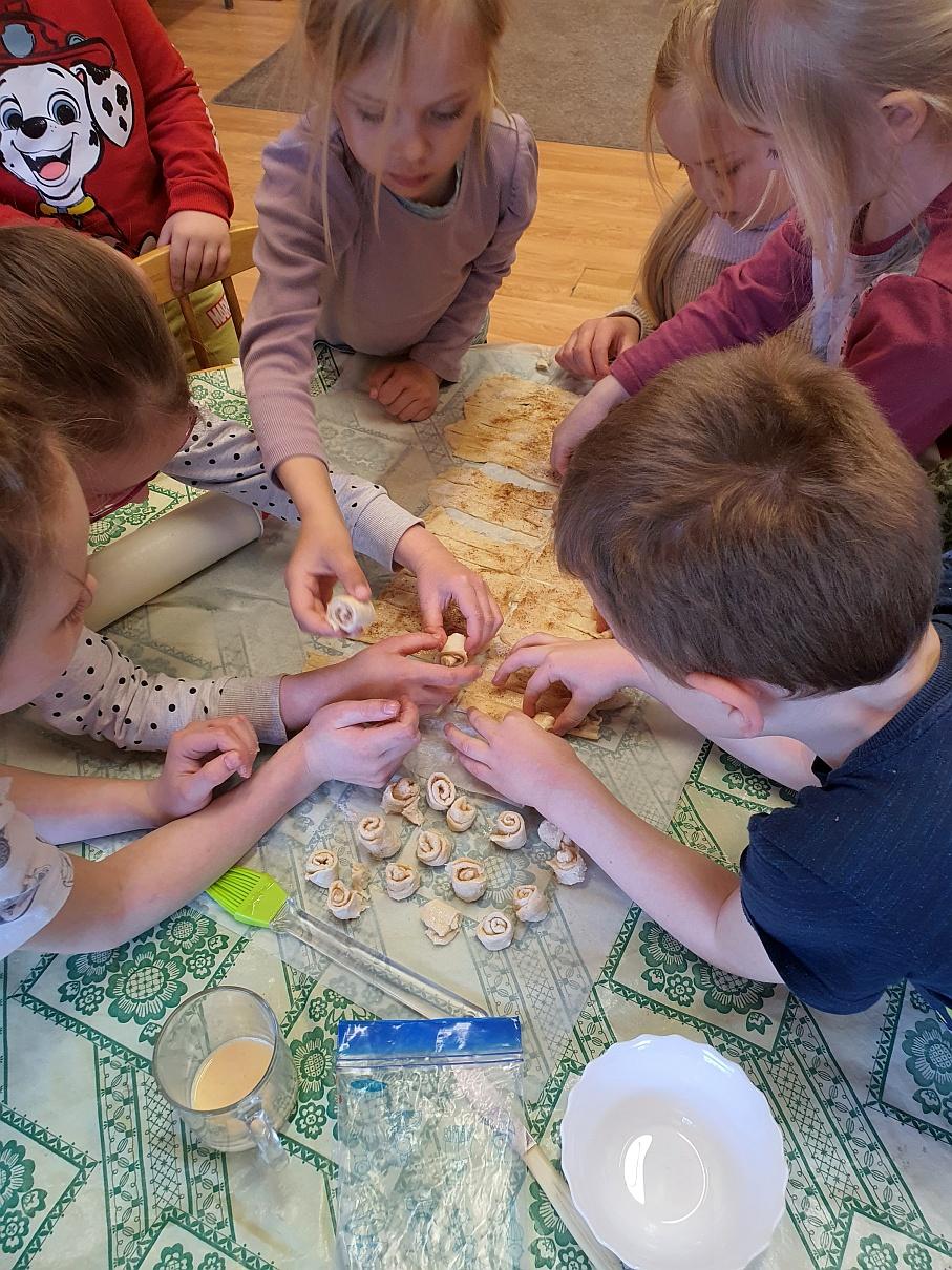 Neljapäev möödus küpsiste valmistamise tähe all. Kõik said tainast rullida, muna kloppida, suhkrut ja kaneeli maitsta ja raputada, samuti taignast rullikesi voolida ja küpsiseid plaadile asetada. Valmis suur korvitäis maiust emadepäevapiknikuks.