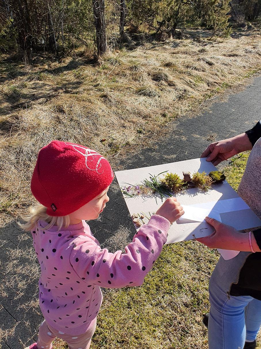 Kingitused jagatud, läksime ühiselt metsaveerde, kus sättisime end mugavalt sisse. Lapsed esitasid pika vahva luuletuse. Õpetaja Anu oli kaasa võtnud lõõtspilli, millega sai toredasti laule, tantse ja mänge saata. Emad elasid rõõmsalt kaasa, laulsid ja mängisid, näod naerul. Ema ja laps koos said nö meeskonnatööd teha loodusliku materjali otsimisel ja sellest seinapildi kokkukleepimisel. Põnevad pildid tulid!